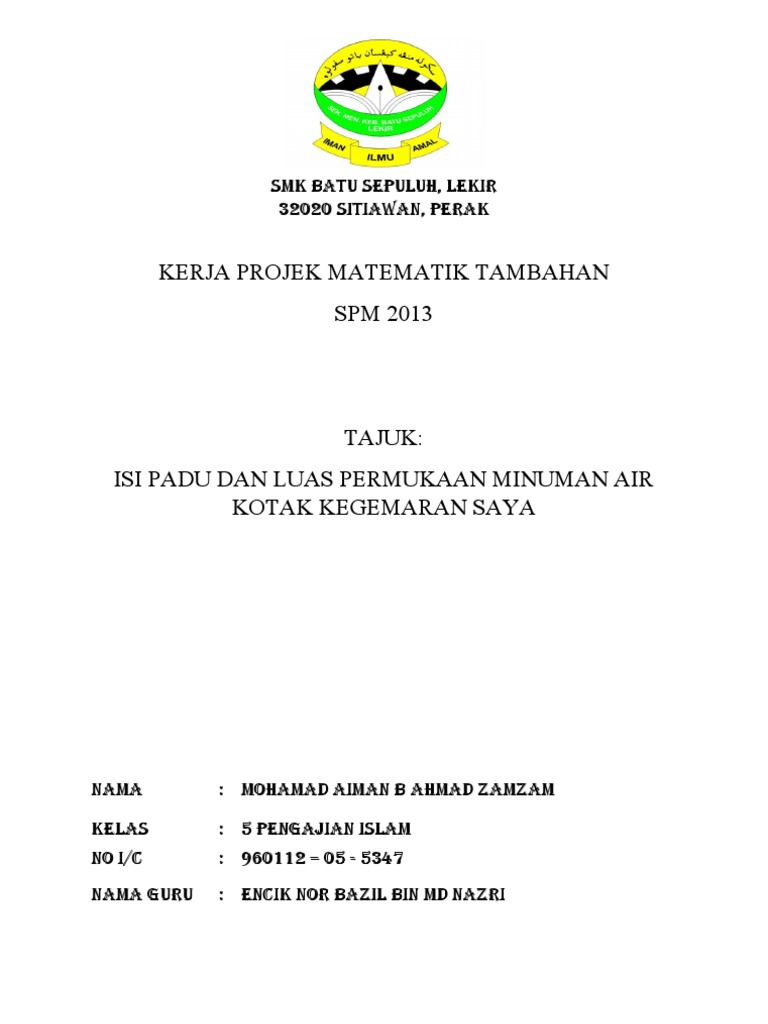 Kerja Projek Matematik Tambahan 2013 Negeri Perak. Untuk makluman jadual waktu peperiksaan SPM 2018 akan diadakan pada 13 November hingga 13 Disember 2018. Kerja Kursus Addmath Ami.