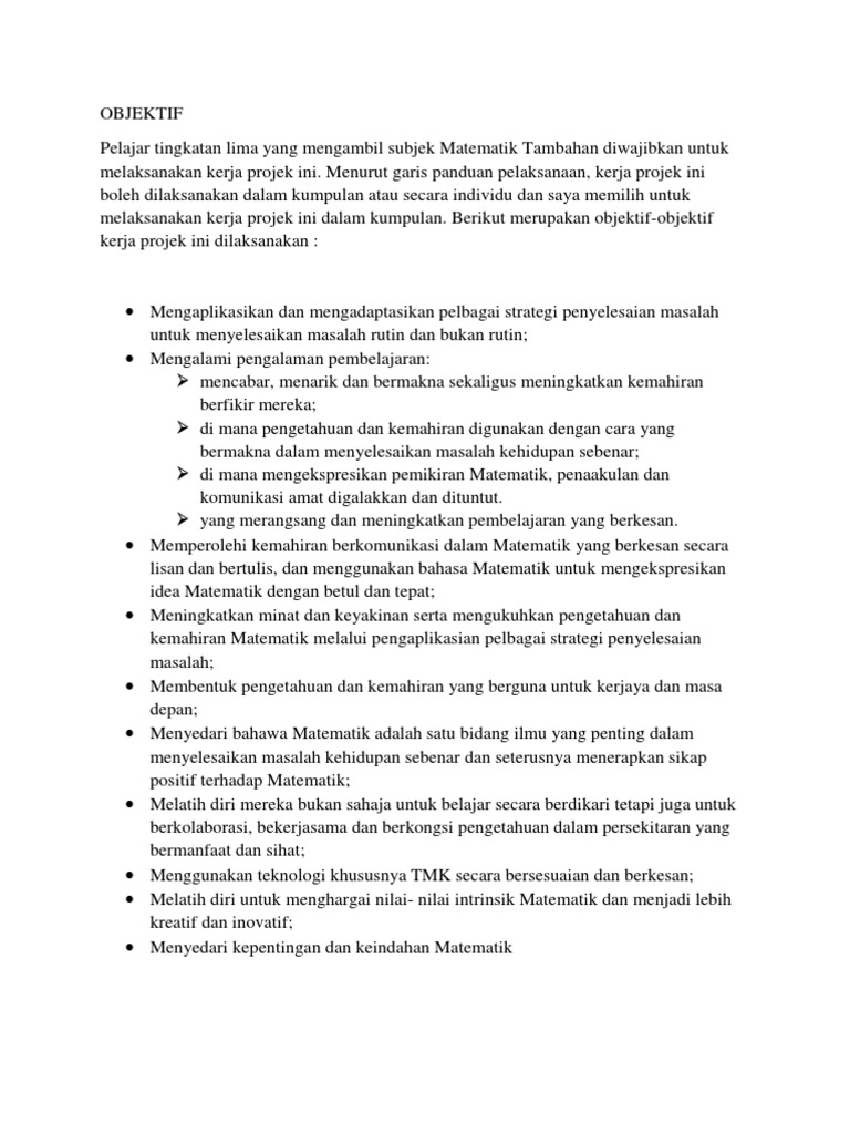 ADDITIONAL Mathematics project work 1 2012 aims to improve thinking skills promote effective mathematical communication and develop positive attitude towards mathematics. Search inside document. Contoh Kerja Kursus Matematik Tambahan 2017.