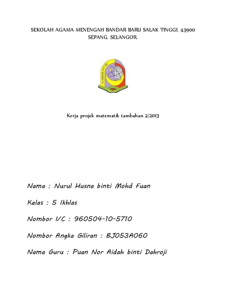 Xiii KERJA PROJEK Kerja Projek merupakan elemen baru dalam kurikulum Matematik Tambahan. SMK CONVENT SENTUL NAMA GURU. Contoh Kerja Projek Matematik Tambahan 2014 Sarawak Add Math Project 2014 Sarawak Berikut disertakan Contoh Jawapan Kerja Projek Matematik Tambahan 2014 Sarawak Form 5 Add Maths Project 2014 Also See and Read This.